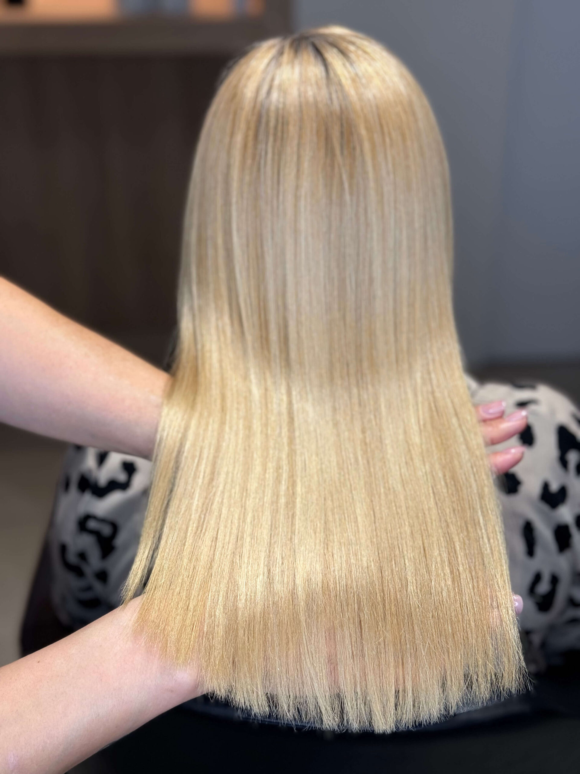 Procedură profesională de refacere a structurii interne a firului de păr, recomandată după decolorări și proceduri agresive.